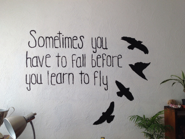 Mi personaja, mi guerrera favorita, mi preciosa, la misma que vale su peso en oro, escribió esta frase en la pared de su cuarto: «A veces tienes que caerte para aprender a volar». Me fascina ver que usa palabras como piedras sobre las cuales poner el pie para cruzar el río, como suelo firme para no dejarse llevar por la corriente, no ceder ante la inercia. Me encanta lo que implica, el hecho de que vea sus cicatrices de vida como anuncio de algo mejor.